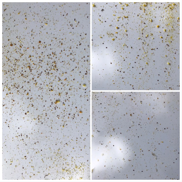 Vier Tage nachdem ich die Ameisensäure in die Beuten gegeben habe, kann man deutlich sehen, dass sich weit mehr Varroen in den Beuten befinden, als bisher angenommen (auf den Bildern die dunklen Punkte).