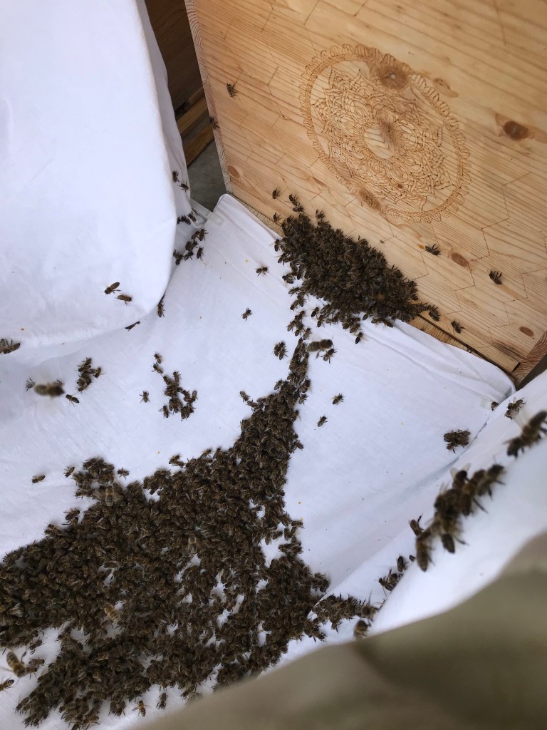 Ich habe ein weißes Leintuch vor den Eingang platziert- bei den Bienen muss der Teppich nicht rot sein- und den Bienenschwarm aus der Schwarmfangkiste heraus auf das Tuch geschüttet.